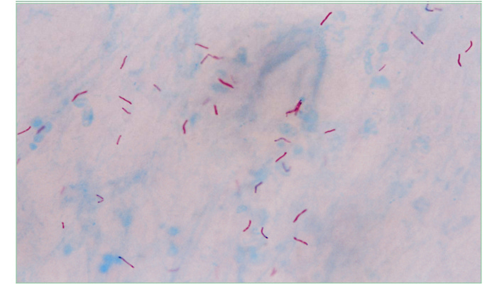 Photomicrograph of red-staining Mycobacterium tuberculosis organisms (“red snappers”) against a methylene blue background. Image in the public domain, content provider: CDC/Dr. Goerge P. Kubica. https://phil.cdc.gov/PHIL_Images/20040615/d094324845a24eb3a7bfe0d1f8e4a637/5789_lores.jpg